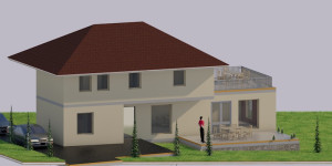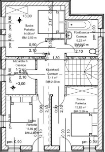 Emeleten: 3 hálószoba (14 m2,14 m2,12 m2), fürdőszoba, háztartási helység.