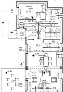Földszinten: amerikai konyhás nappali (39 nm), fürdőszoba, wc, 1 hálószoba(11,2 m2), terasz (15,45 m2).